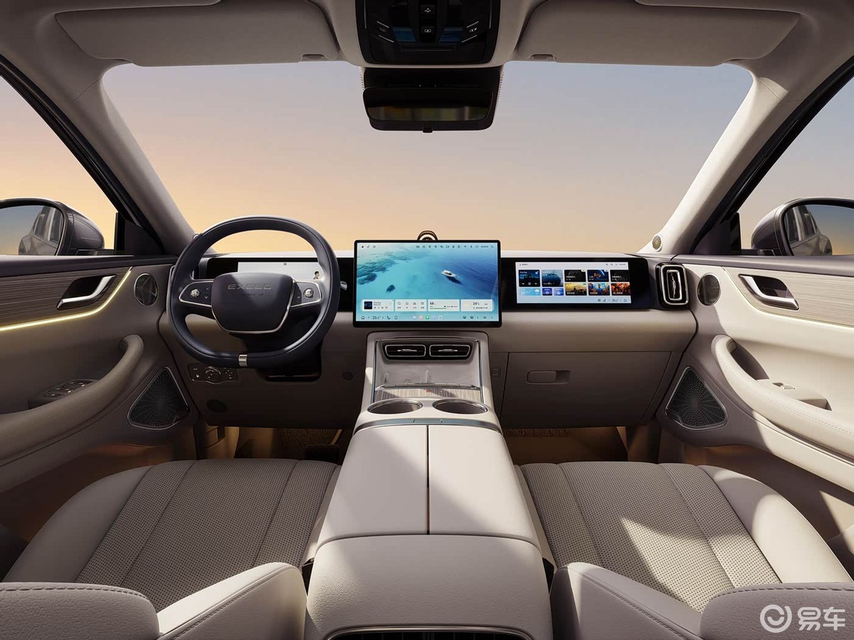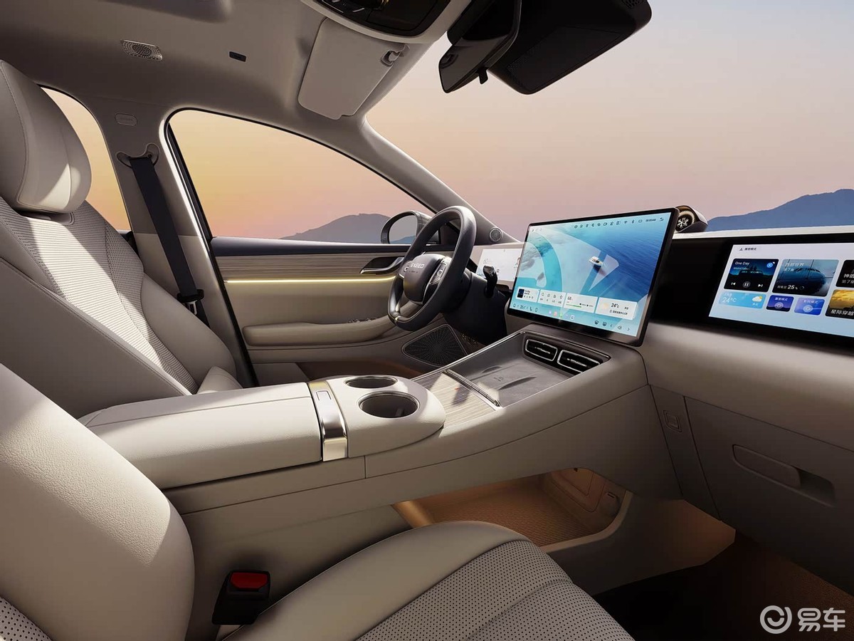 进入车内,最引人注目的是由三块屏幕组成的交互系统,包括10.25英寸液晶仪表、15.6英寸中控屏和12.3英寸副驾娱乐屏,其车机核心为高通骁龙8255芯片,并深度整合了AI语音交互功能。内饰提供暖阳米与沐光橙两种配色,高配车型还配备了21扬声器的“伯牙之音”音响系统、前排座椅加热通风按摩,以及带主动散热的50W无线充电等配置。