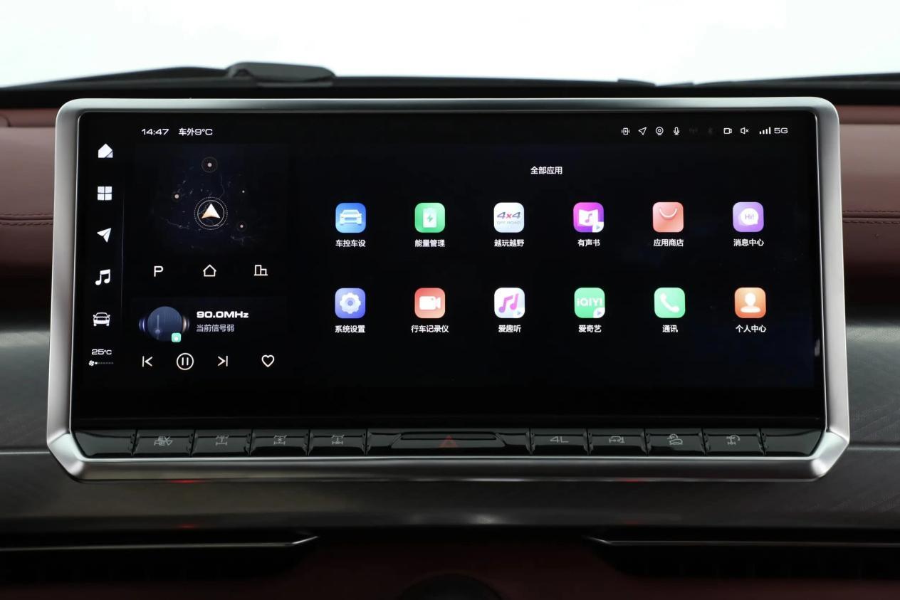 坦克700 Hi4-T属于插混新能源车,它采用3.0T发动机+120kW前置单电机+37.1kWh三元锂电池,零百加速都是5.6s,WLTC纯电续航分别为90/85km,其综合续航尚未公布,WLTC百公里亏电油耗最低10.9L。底盘由前、后双叉臂式独立悬挂构成,中、高配车型还配备了单腔空气悬挂,悬挂支持软硬+高低调节,在过坑洼路面时,可将底盘调高,通过性更好一些,但应对减速带和非铺装路面时,可提前将悬挂调软,舒适性要好一些。